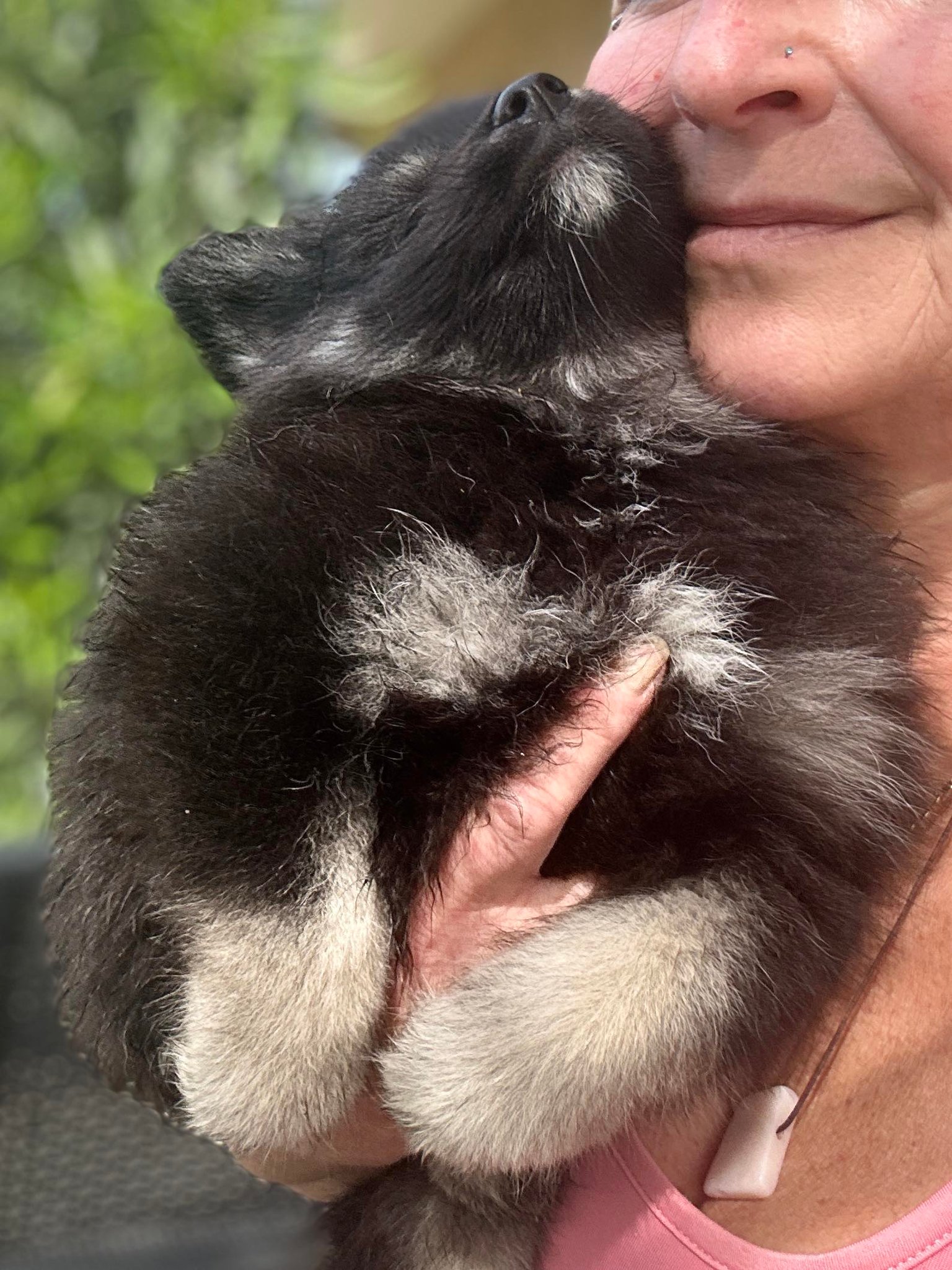 Trois mâles et une femelle ont vu le jour et ont rejoint leurs familles. Une femelle noire et blanche marquage Husky aux yeux bleus, un mâle d'un noir profond aux yeux gris, un mâle crème et blanc marquage Husky aux yeux bleus, un mâle auburn avec une tête noire !