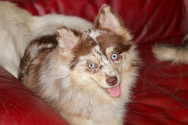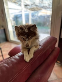Téquila est une Pomsky merle chocolat de taille miniature née des amours d'une toute petite Husky rousse et blanche et d'un Spitz nain tricolore aux yeux bleus. Je ne suis pas toujours fan des merles dont les taches ne sont pas forcément très heureuses mais quand j'ai vu sa photo j'ai immédiatement eu un coup de foudre. C'est une coquine gracieuse et extrêmement tendre...