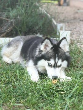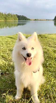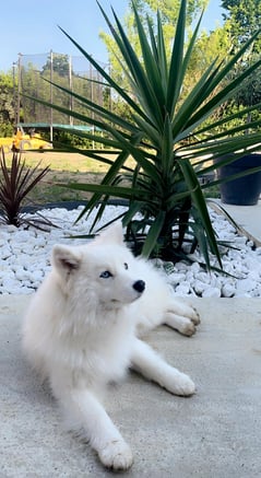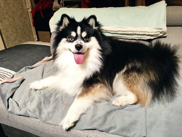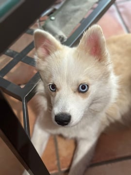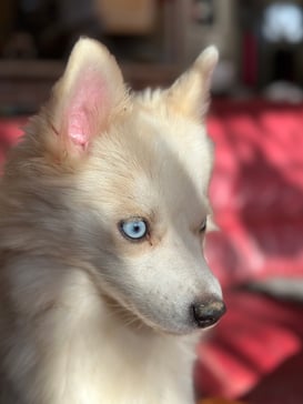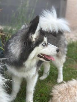 Pomsky F3, née en Alsace dans l'élevage de ma cousine "Au Pays du Pomsky", elle est directement issue de ma lignée (Husky / Pomeranian), Olya est sa grand-mère. Un brin voleuse, la coquine apprend les bonnes manières et les moins bonnes au contact de la meute qu'elle adore !